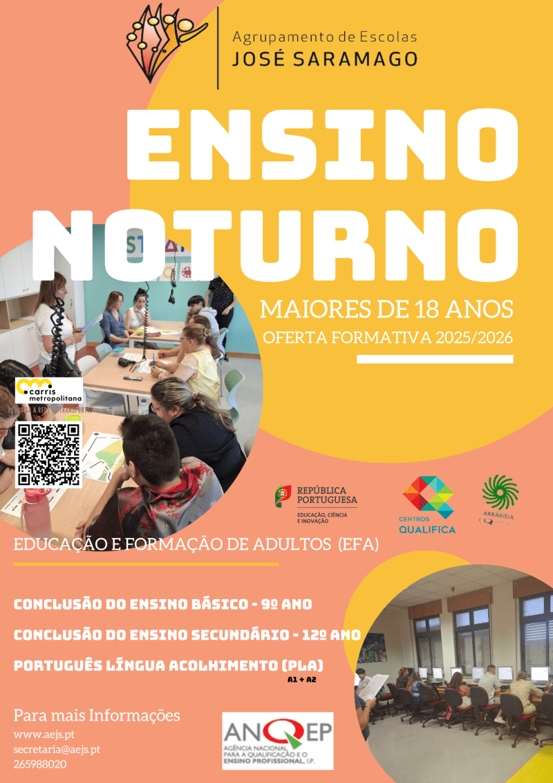 O AE José Saramago promove a educação e formação de adultos (EFA) através de oferta formativa em regime noturno, que inclui percursos de conclusão do Ensino Básico e do Ensino Secundário, bem como cursos de Português Língua de Acolhimento para estrangeiros (PLA).